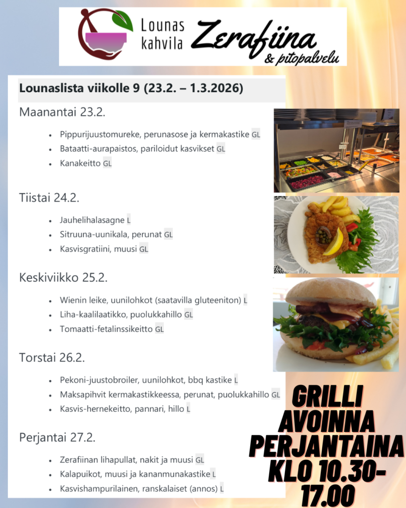 Lounasbuffet on tarjolla arkisin klo 10.30–13.30. Hinta on 13,30 €. Tervetuloa!